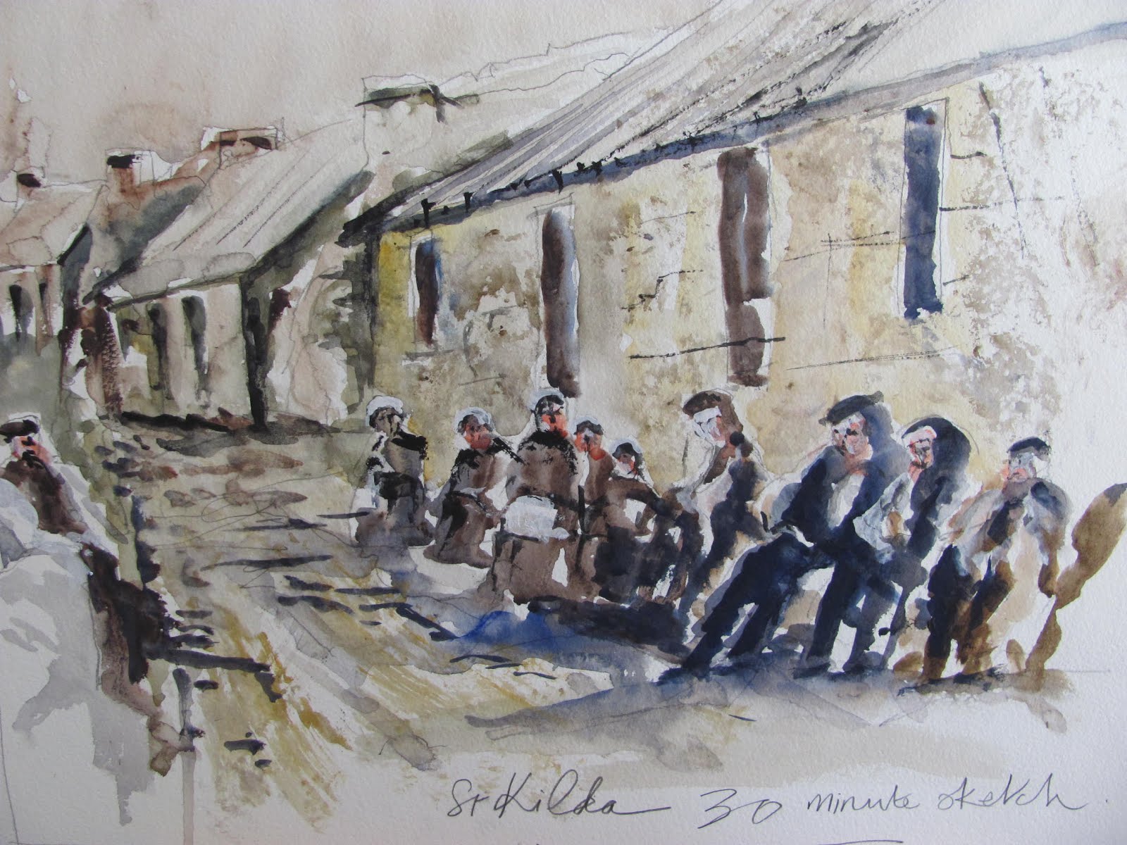 This was a 30minute sketch including drawing and painting. It was based on an old black and white photograph - very hazy and gloomy. St Kilda is the remotest island off the Orkney isles from North West Scotland. It was inhabited for centuries and the last dwindling inhabitants were removed at their own request in 1930. Life was very harsh and sea birds formed an important part of their diet. The subject was buildings which I don't do these days - not a favourite of mine. Colours as you can see are basically puddle colours mainly mixed from Ultramarine Blue and Translucent Brown from Schmincke. This latter has been re-named Transparent Brown in the recent updating of the range. I don't like this paper much.